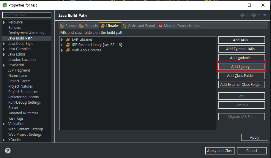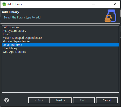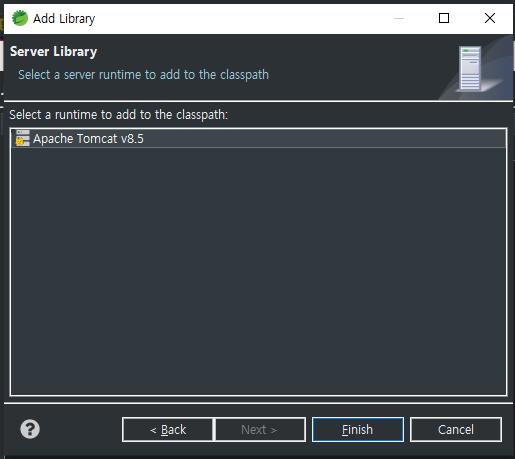 다음과 같이 add library 로 들어가서 서버 런타임을 설정해주면 된다. apache/tomcat을 설치했다면 설치한 버전으로 라이브러리를 발견할 수 있을 것이다.