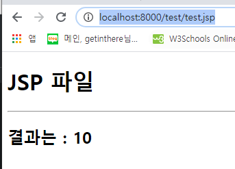 처음 <% %> 코드 내부의 값은 보이지 않는다. 여기 내부에 자바 코드를 입력하면 tomcat 등의 웹 컨테이너들이 컴파일 해줄 것이다. 이 a=10을 웹페이지에 out 시키려면 <%= %>로 입력하면 변수를 출력할 수 있다.