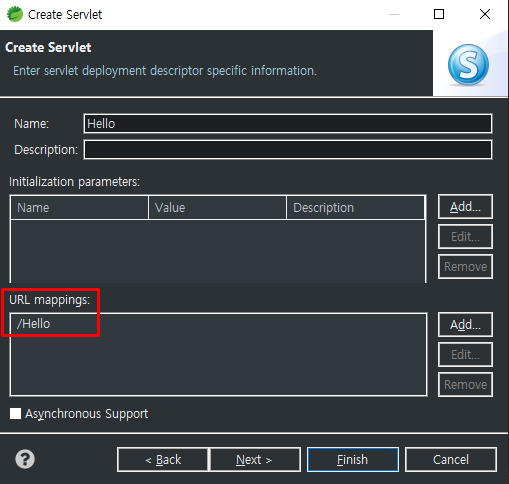 앞서 설정한 식별자를 웹서블릿 어노테이션에 넣으면 이 값을 바탕으로 다음 서블릿에 접근할 수 있게 해준다.
