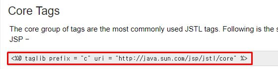 그런데 문제가 있다. 이 형태는 HTML내부에 c:를 붙이는 형태라 원래 태그를 정의하는 HTML은 이 태그를 오류로 받아들인다. 이 문제를 해결하기 위해서 다음 사이트의 코어 태그를 가져와야 한다.