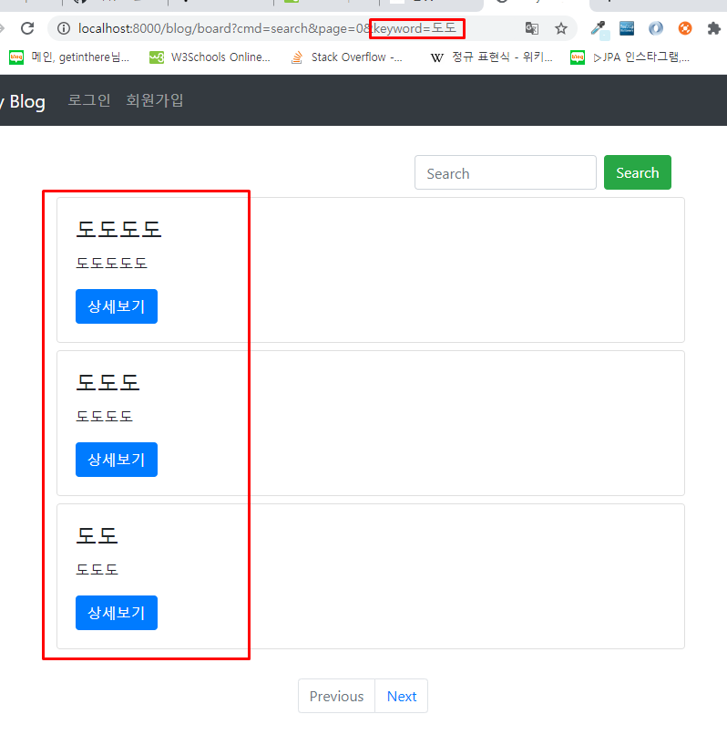 이 때 좀 주의할 점이 있는데, action에 암만 /blog/board/cmd=search&page=0 이렇게 걸어도 막상 누르면 쿼리 스트링은 죄다 사라지고 keyword만 쿼리스트링으로 남아버리기 때문에, hidden 속성을 이용해 함께 날려주자.