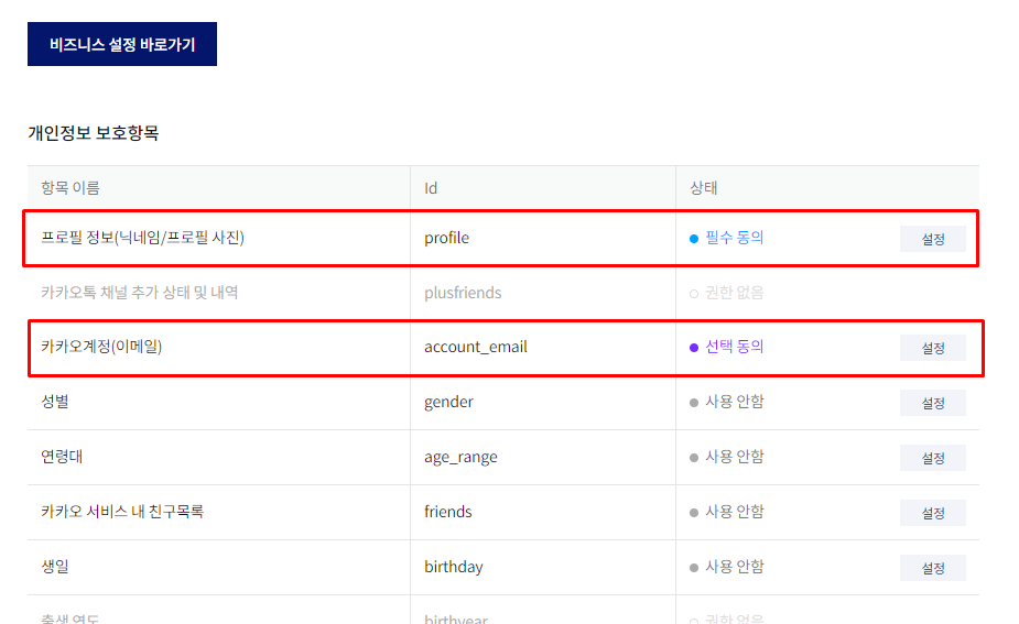 이것은 아까 애플리케이션 설정을 했던 내 애플리케이션 - 동의항목에서 설정 가능하다.