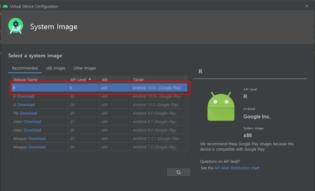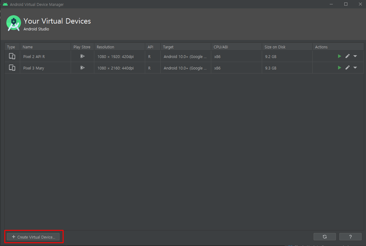 다음 그대로 finish 눌러서 적용하면 디바이스 목록에 만든 가상 디바이스가 생깁니다.