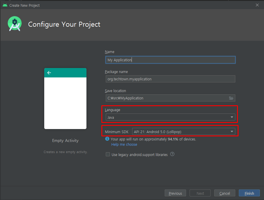 필자는.. 자바가 편하기 때문에 개발 언어를 자바로 두고, minimum sdk를 설정한다.