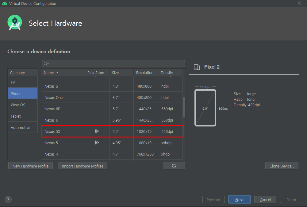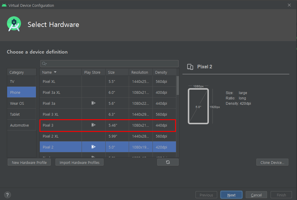 보통은 Nexus 5s를 주 가상기계로 이용하는데, 필자는 Pixel3로 이용합니다.