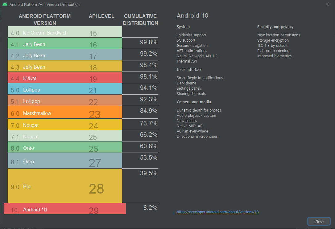 이 표가 현재 인구가 사용하는 안드로이드 버전표입니다. 삼성 갤럭시의 가장 높은 업데이트가 10인데, 8퍼센트 인구밖에 없다고 하네요 ㅎㅎ
