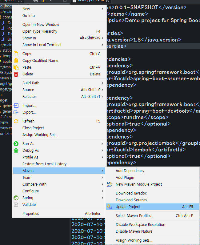 2) 프로젝트 우클릭 - maven - Update Project