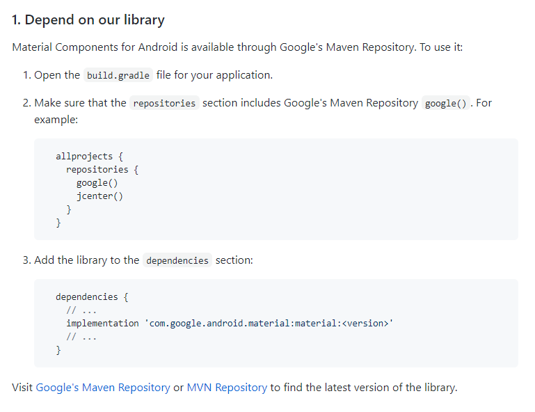 Material Components for Android is a static library that you can add to your Android application in order to use APIs that provide implementations of the Material Design specification. Compatible on devices running API 14 or later. VersionRepositoryUsagesD