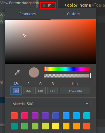 안드로이드 스튜디오는 다음과 같이 색상 파레트를 선택하면 색상을 편안하게 지정할 수 있다.