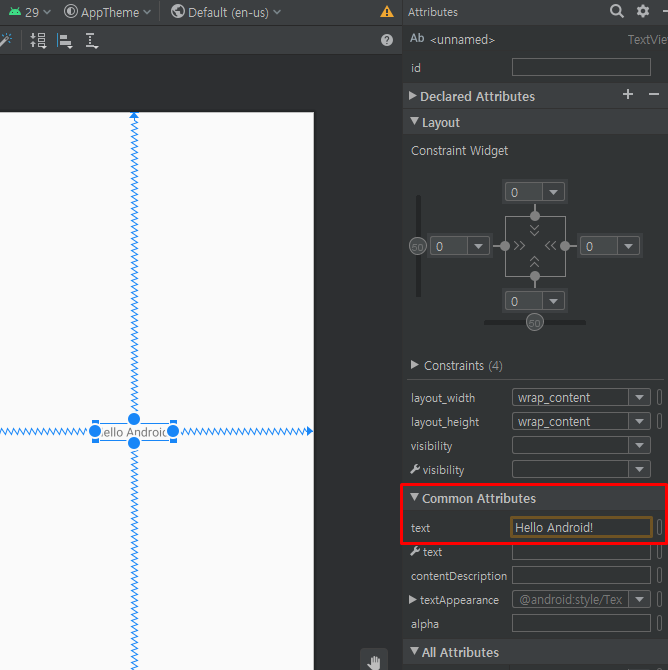 두 번째 줄이 바로 Hello World! 메세지를 가지는 디자인 액티비티를 파라메터로 받아 화면을 출력시킨다.