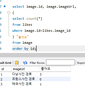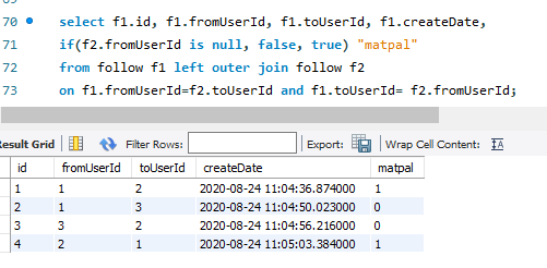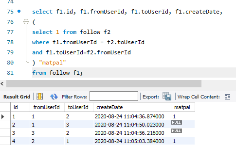 이 상황에서는 맞팔을 확인할 수 없다. 따라서, 이럴 때는 서브쿼리 등을 이용해서 컬럼을 하나 더 만들어 참조하는 형태로 만들어야 한다.
