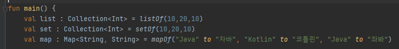 val map : Map<String, String> = mapOf("Java" to "자바", "Kotlin" to "코틀린")