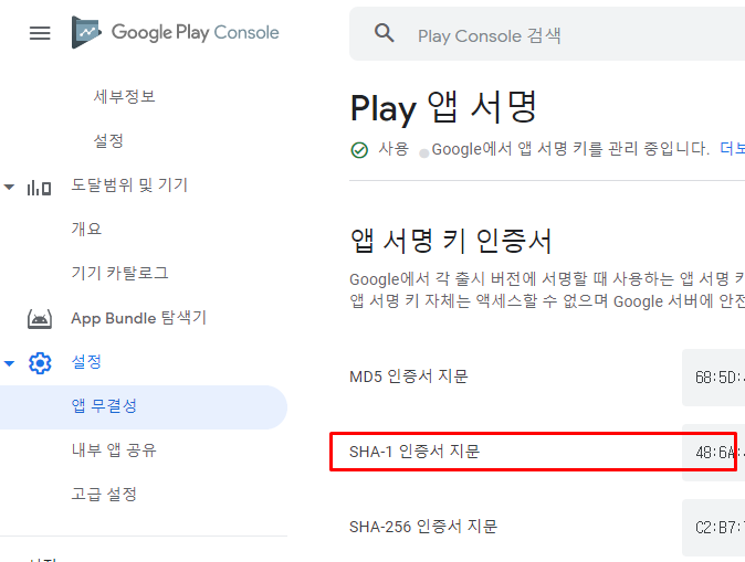 구글 플레이스토어에 앱을 올리면, 앱을 따로 google signing을 통해 승인 받는데요, 이러면서 또 SHA-1 이 변경됩니다.