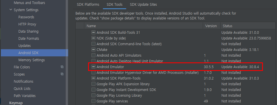 필요한 안드로이드 SDK 버전 파일을 다음과 같이 설치합니다.