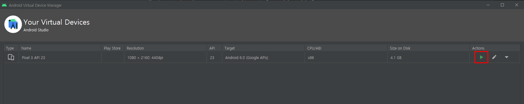 마지막으로 다시 한번 우측 상단의 휴대폰+안드로이드 아이콘을 클릭하고, 화살표 버튼을 눌러 에뮬레이터를 실행합니다.
