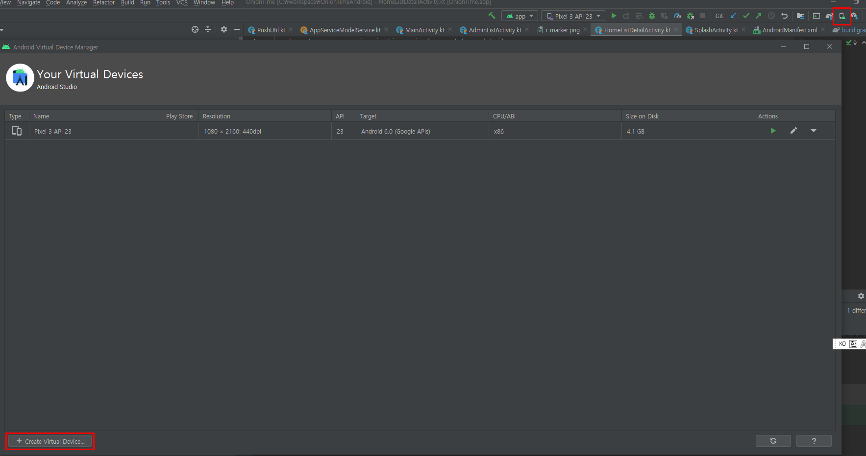 다운로드가 완료되면, 오른쪽 상단에 안드로이드+휴대폰 같은 아이콘을 누르고, Create Virtual Device를 선택합니다.
