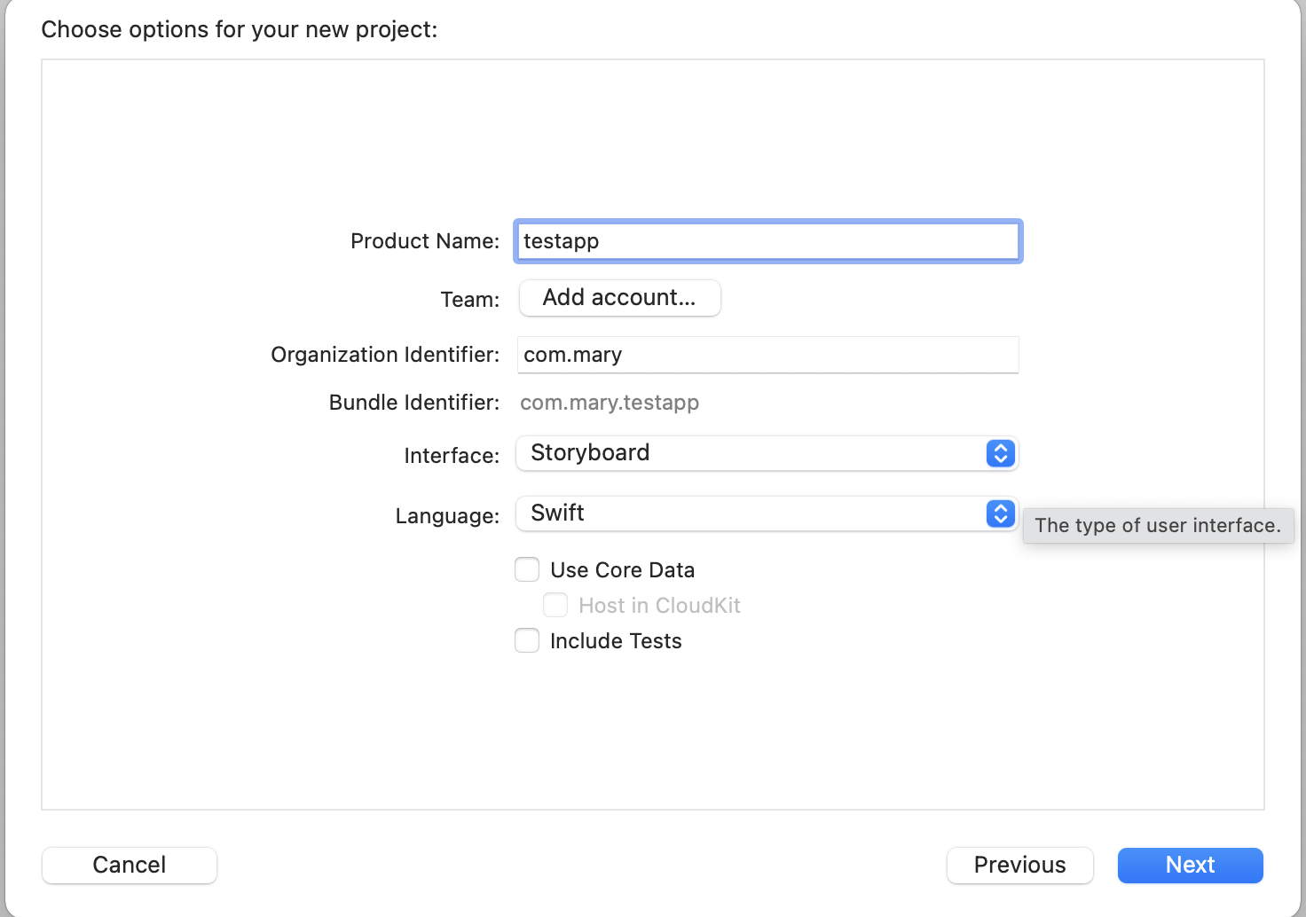 그럼 다음과 같은 창이 뜨는데, 우리는 Swift 개발을 할 거기 때문에 Swift언어를 선택해주고,