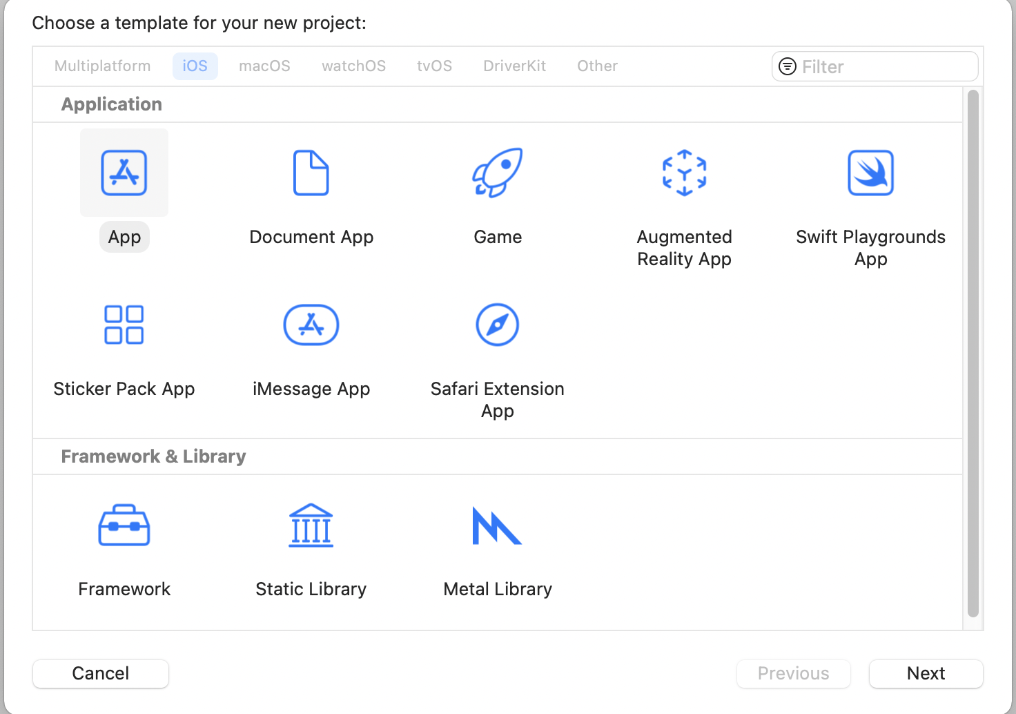 윗줄의 ios탭을 클릭하고, 내부에서 app을 선택한다.