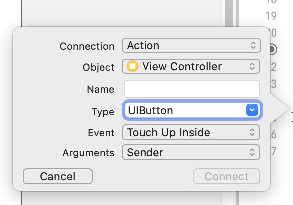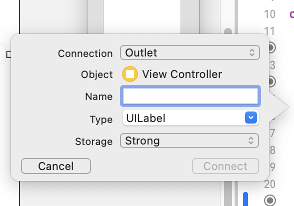 함수명을 입력하고 Connection을 클릭하면 요소와 결합된다. 이 때 앞에 @IBOutlet이 어노테이션처럼 연결된다.