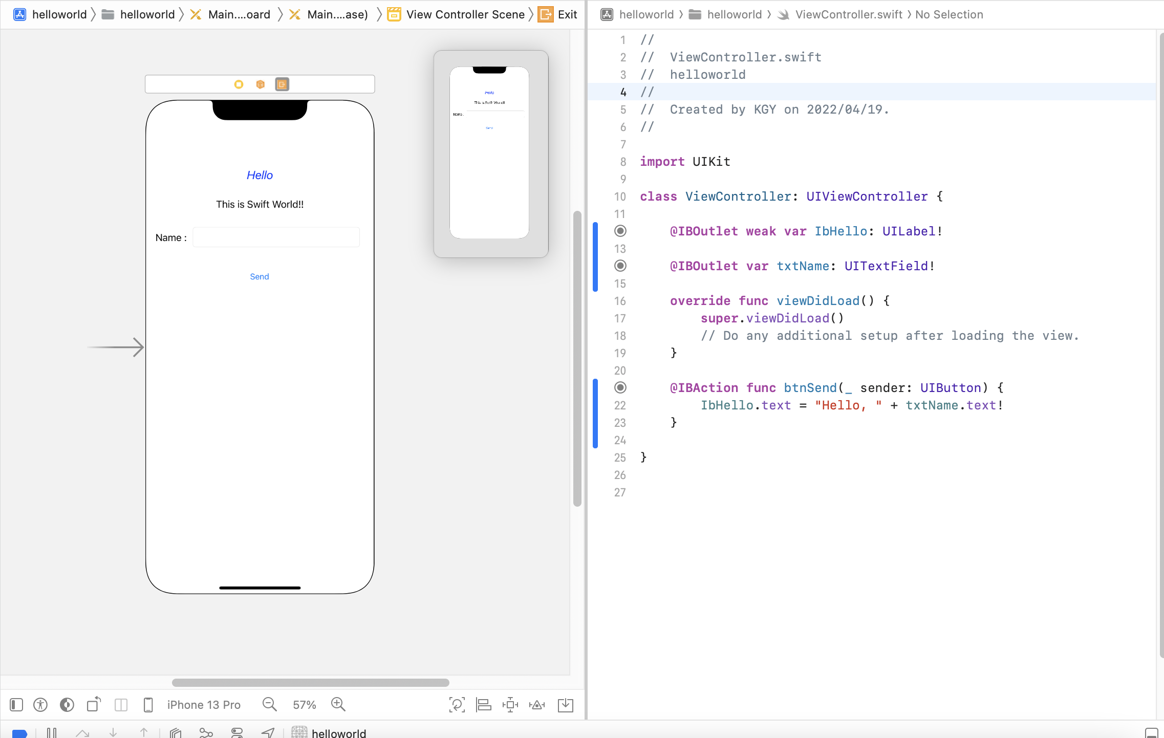 이 함수는 IBhello라는 이름으로 연결된 객체의 텍스트를 txtName(여기서는 text field이다.)의 텍스트로 변경하도록 유도하는 코드이다.