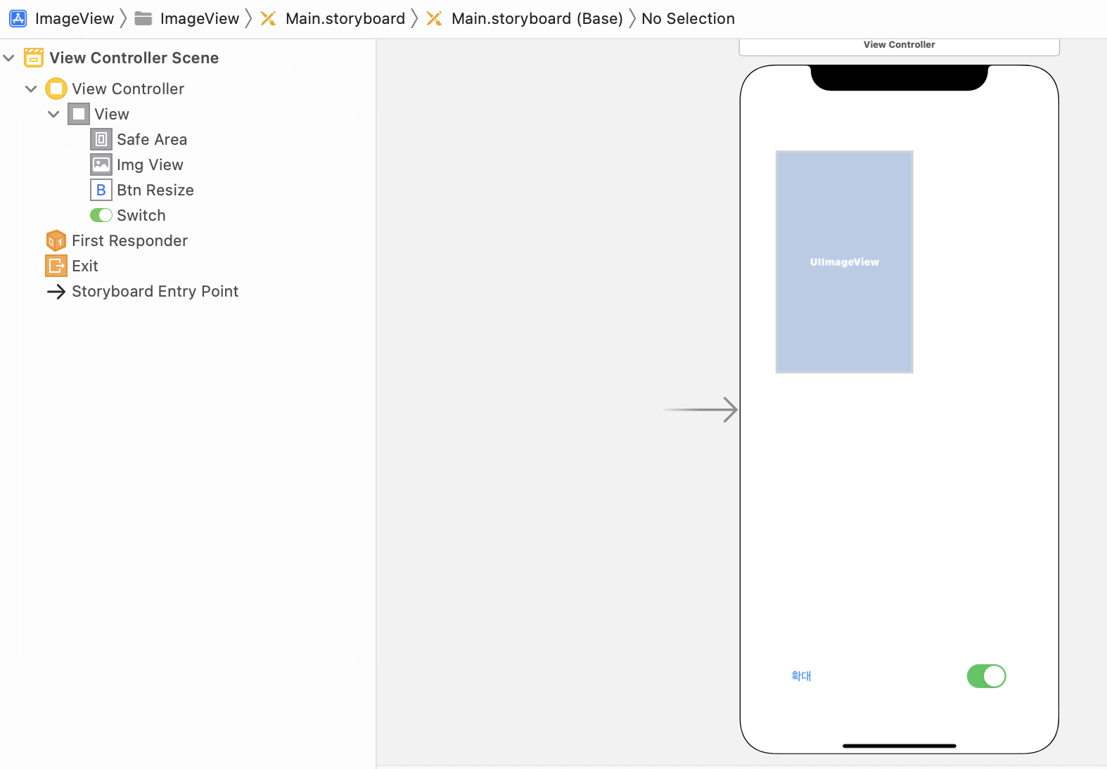 먼저 Main 스토리보드를 켜서 ImageView, button, Switch를 각각 원하는 위치에 내려놓는다.