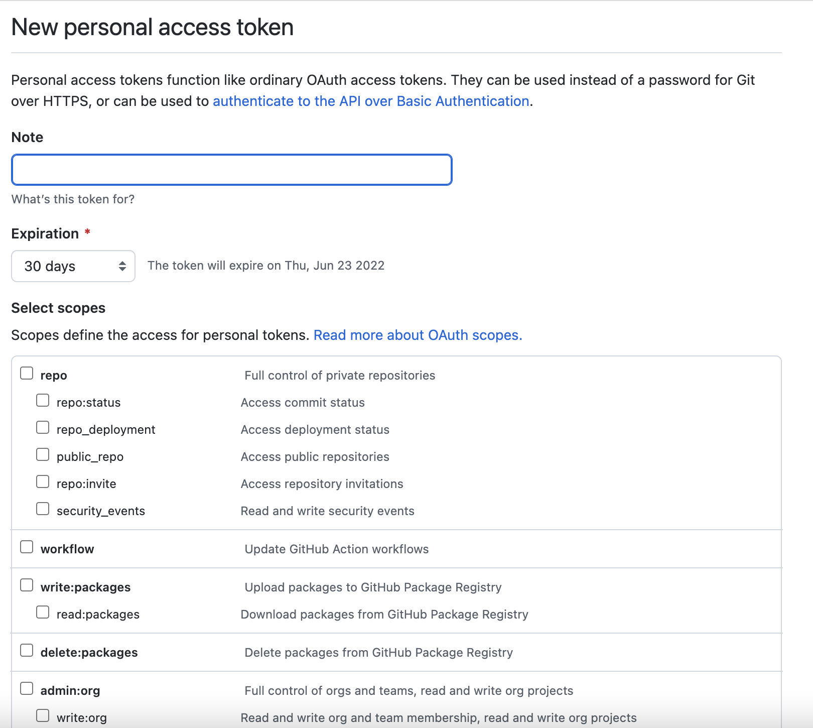 여기서 repo 관련과 admin:org 부분 전체만 선택 해주세요. 그리고 아래의 초록색 Generation token을 클릭 해줍시다.