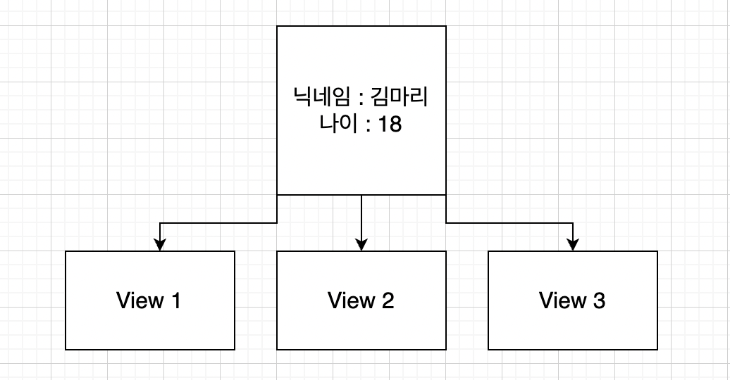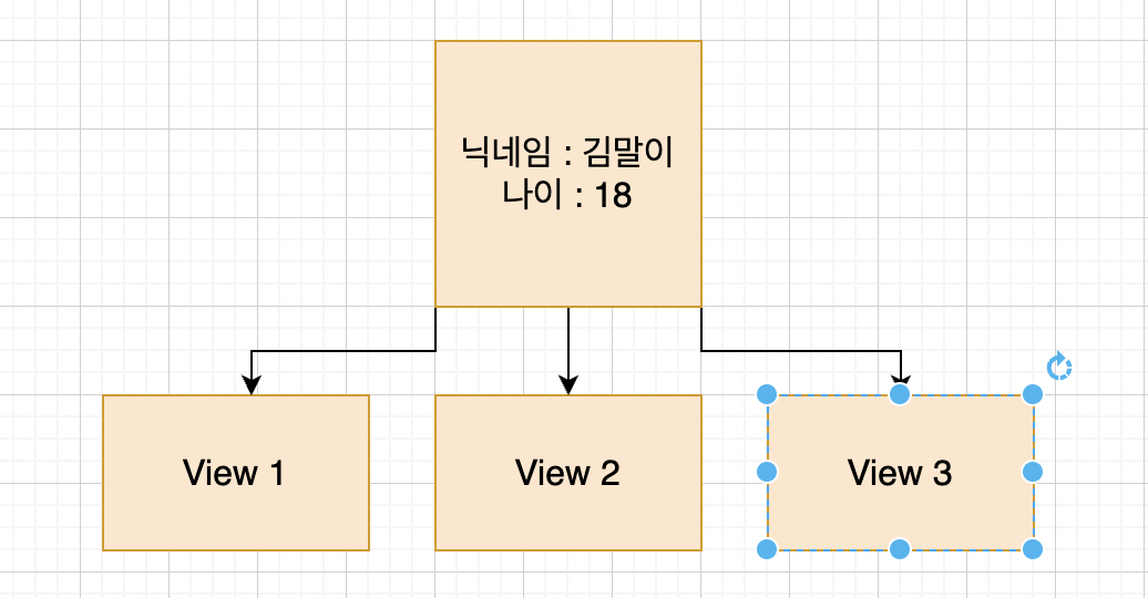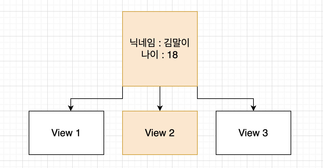 만약 하나의 데이터 인스턴스만 있고, 뷰에서 간접적으로 접근한다면 어떨까? 다음과 같은 데이터 다이어그램이 만들어질 것이다.