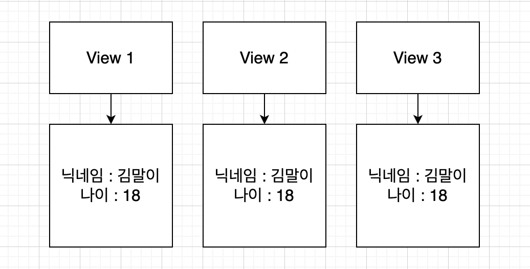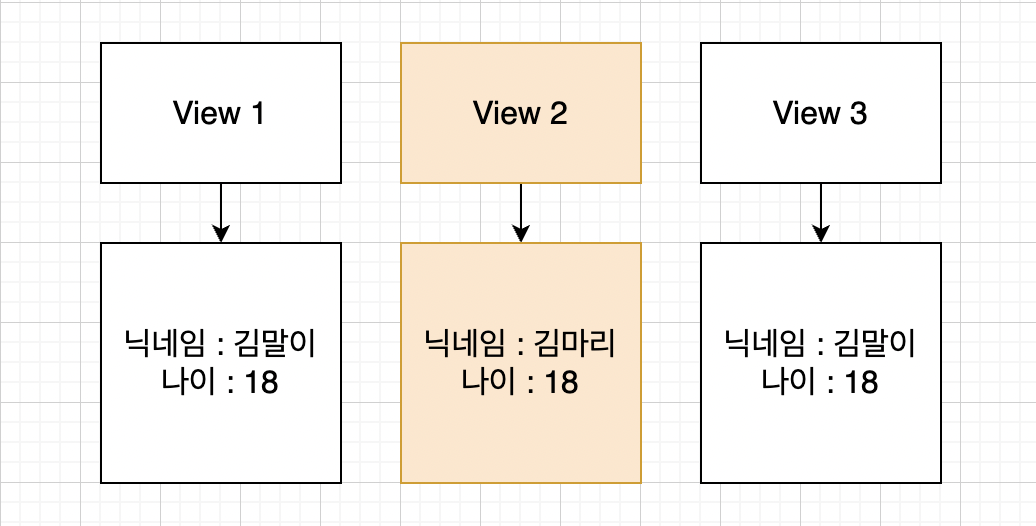 그런데 뷰1이랑 뷰3도 같은 인스턴스를 참조하기 때문에 결국은 같은 데이터를 가지게 된다.