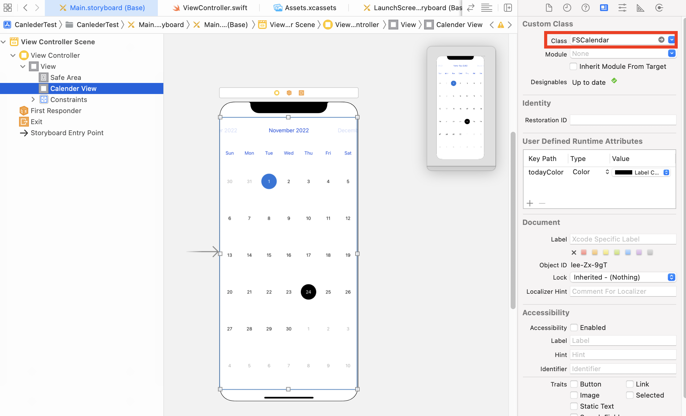 스토리보드에 UIView를 추가하고, 인스펙터에 Custom class에서 FSCalendar을 찾아서 추가해준다(왼쪽 빨간 네모). podfile을 정상적으로 작성하고 pod install을 정상적으로 했다면 클래스를 찾을 수 있을 것이다.