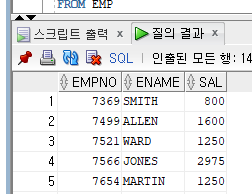 다음과 같이 컬럼 EMPNO, ENAME, SAL만 출력된다.