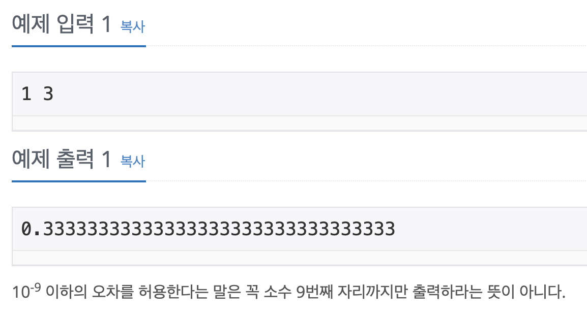 라는 조건이 있다. 실제로 float를 10자리까지 늘려보면 0.3333334333로 출력되므로, 10^-7에서 오차가 발생한다. 즉, 문제의 취지에 옳지 않다. 따라서 double 자료형을 사용한다.