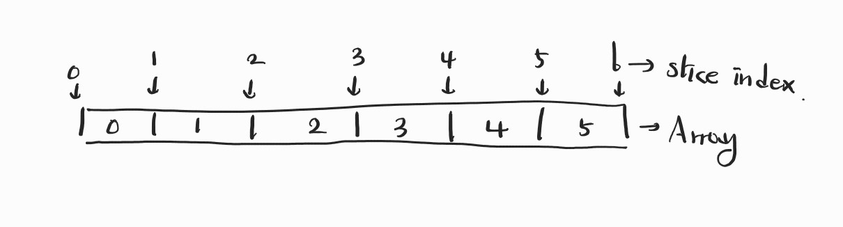 따라서, 예시를 보면 배열의 0번째를 제외하고 자르고 싶다면 1번 인덱스에 첫번째로 칼을 넣고, 6번 인덱스에 마지막으로 칼을 넣으면 배열이 원하는데로 잘린다. 6은? 잘 보면 배열의 전체 크기와 맞는다는 것을 알 수 있다.