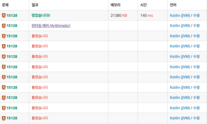 이 문제는 (다른 언어는 모르겠는데) 자바 코틀린은 부동소수점 문제로 인해 걸린다. 그래서 실수 연산에서 걸리게 된다.