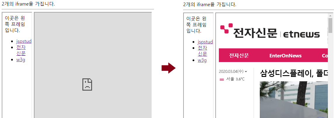 이 name 속성과 <a>태그를 학습할때 이용한 target 속성을 이용하면 두 개의 인라인 프레임을 이용하여, 왼쪽에서 링크를, 오른쪽에서 링크에 해당하는 페이지를 출력하는 것도 가능하다.