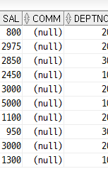 다음과 같이 COMM에 null값이 전혀 없는 것이 보인다. 반대로 is NULL을 써보자.