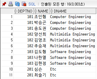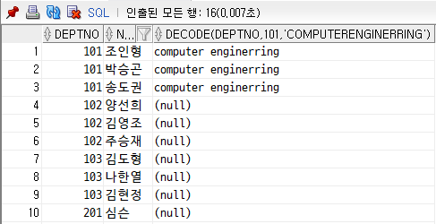 다음 DECODE문은 바깥의 DOCODE로 101호를 걸러내고, 101호중에서도 추가로 '조인형'이라는 선생님을 걸러낸다.