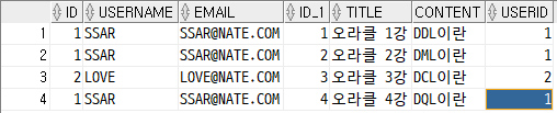 세 개의 조인을 설정하여 두 개의 조건을 배열했다(u에 조건을 걸지 않으면 카티션 곱이 적용되어 덧글이 6개로 나옴!)