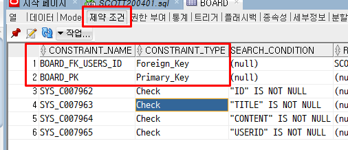 이렇게 기본 키와 외래 키의 제약 조건 확인은