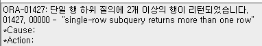 3개 행이 실행되어 있음을 볼 수 있다. 그렇기 때문에 서브쿼리에서 어떤 값을 써야할 지 알 수 없게 되어버린 것이다. 이렇게 행이 두개 이상 나오게 되는 것을 다중 행 서브쿼리라고 한다.